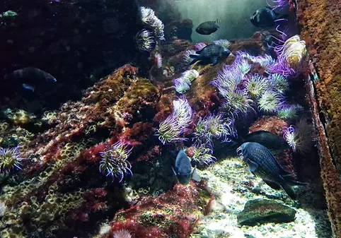 Unser größtes Mittelmeerbecken mit Wachsrosen, Pferdeaktinien, Gelben Krustenanemonen, jeweils einem Schriftbarsch, Sägebarsch und einem Meerjunker, einigen Krabben, Schwämmen, Seeigeln und Einsiedlerkrebsen. Die Wassertemperatur wird konstant unter 20 °C gehalten. (Stand 2023)