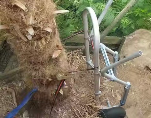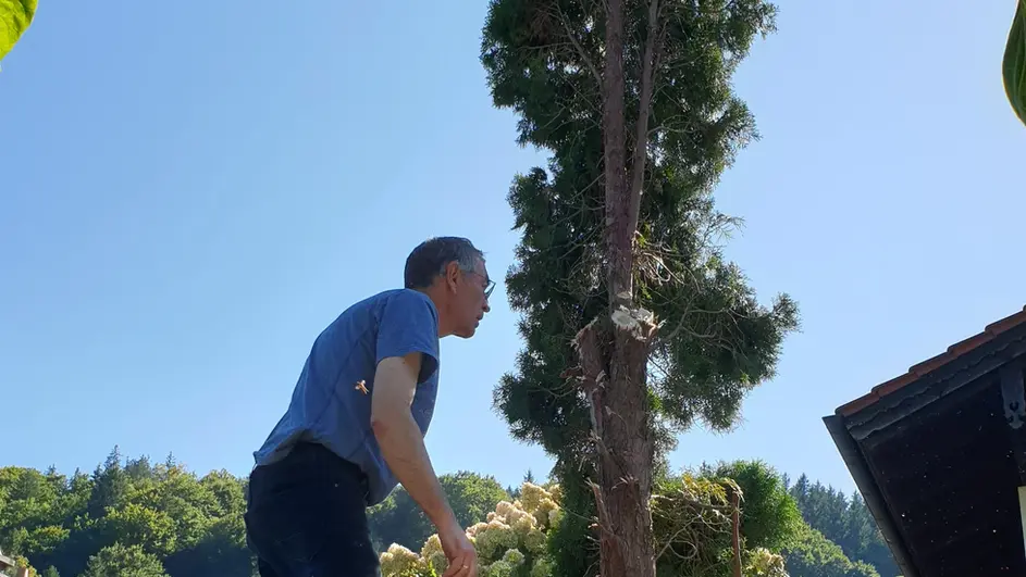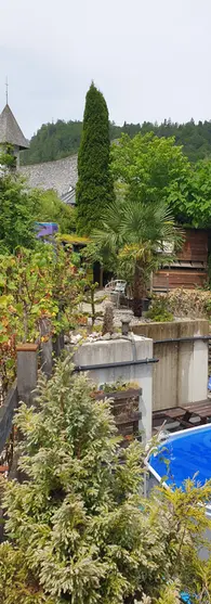 Um Platz für einen Anbau für unsere Imkerei zu schaffen, musste meine größte, und am längsten ausgepflanzte Chinesische Hanfpalme an einen neuen Standort umziehen. Das war leichter gesagt als getan. Das Ausgraben und transportieren an den neuen Platz hat einige Stunden an Zeit und viel Schweiß gefordert. Die Palme stand immerhin fast 10 Jahre dort und war dementsprechend stark verwurzelt und mit rund 200 kg auch ordentlich schwer. Da ich bei dieser Aktion alleine war, musste ich mir mit allerhand Werkzeug, wie Spanngurten, Pickel, Spaten und einer Sackkarre behelfen. Am Ende des Tages stand die Palme dann am neuen Standort und bereitet an diesem Platz viel Freude, da man sie dort auch vom Pool aus sehen kann, wo die stattliche Hanfpalme für Urlaubsgefühle sorgt.